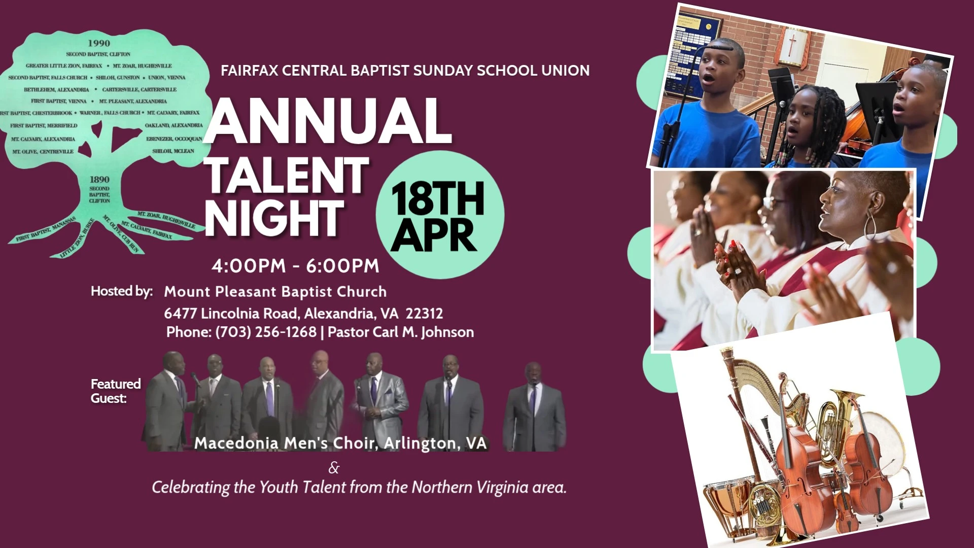 FCBSSU Talent NiteSponsored by the Fairfax Central Baptist Sunday School Union. Featured guests: Macedonia Men's Choir, Arlington, VA. Celebrating the youth talent from the Northern VA area. All Invited!Download EventDetailsDateSaturday, April 18, 2026Time3:00pm - 5:00pmLocation, 6477 Lincolnia Rd, Alexandria, VA US 22312